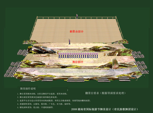 (本網(wǎng)訊)7月28日,經(jīng)過近一個(gè)月的設(shè)計(jì)創(chuàng)作,湖南省民族歌舞團(tuán)舞美設(shè)計(jì)師舒千龍完成2008中國湖南國際旅游節(jié)大型實(shí)景演出“擺手舞天下”舞臺(tái)、舞美設(shè)計(jì),并制作出多角度效果圖。2008中國湖南國際旅游節(jié)總導(dǎo)演陳偉康及本屆旅游節(jié)開幕式場地組組長姜陽春等專家反復(fù)進(jìn)行了論證,在與2008中國湖南國際旅游節(jié)執(zhí)委會(huì)的確認(rèn),最終方陣與舞臺(tái)整體設(shè)計(jì)方案塵埃落定。