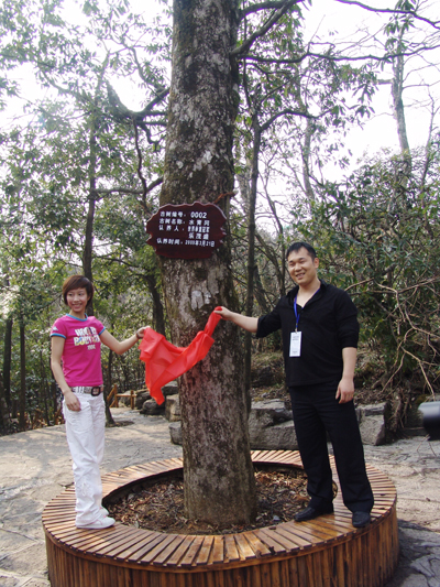 奧運(yùn)冠軍凌潔(左)和樂(lè)茂盛(右)為認(rèn)養(yǎng)的古樹(shù)揭牌