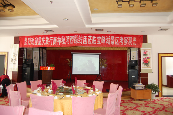 2009年3月29日,來(lái)自重慶的旅游商會(huì)、江北區(qū)旅游局及13家旅行社等100人考察商在走訪了神秘湘西之后抵達(dá)人間仙境張家界,來(lái)到山歌的海洋--寶峰湖。寶峰湖景區(qū)總經(jīng)理童鈞、營(yíng)銷總監(jiān)任建華、張股公司湘西片區(qū)營(yíng)銷總監(jiān)劉英杰全程陪同。 游覽過(guò)程中,考察團(tuán)對(duì)奇峰飛瀑的壯觀、土家山歌的婉轉(zhuǎn)動(dòng)人給予了高度評(píng)價(jià)。泛舟湖上,孔雀開(kāi)屏、半臉八戒、金蟾含月等都令其贊不絕口。游至送客松,當(dāng)導(dǎo)游介紹到寶峰神女的時(shí)候,所有人都發(fā)出感慨:真是世間絕景--其外形亭亭玉立,婀娜多姿,從湖面兩米處往上看,那邊扁平的部分神似一位美女臉部的左側(cè),她目光凝視前方,緊緊抿著的櫻桃小嘴、高高挺起的鼻梁,似乎正在對(duì)這湖水梳妝打扮,二頭上的那部分便是高高盤起的發(fā)髻。 考察結(jié)束后,雙方就對(duì)重慶與張家界兩地的旅游文化進(jìn)行交流,在兩地旅游資源的共享與互補(bǔ)上達(dá)成共識(shí),一致認(rèn)為在以后要緊密合作,攜手打造精品旅游,更好的帶動(dòng)兩地的旅游發(fā)展。