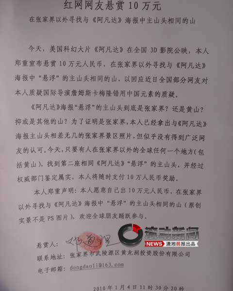 1月4日,美國科幻大片《阿凡達》在中國內(nèi)地3D影院正式公映,曾經(jīng)炮轟該片導(dǎo)演詹姆斯卡梅隆“張冠黃帶”誤將黃山說成張家界的網(wǎng)友“hldddl”同日宣布:由他本人懸賞10萬元,面向全球?qū)ふ业诙嗤栋⒎策_》海報中“懸浮”的主山頭,以回應(yīng)近日全國部分網(wǎng)友對他質(zhì)疑國際導(dǎo)演詹姆斯卡梅隆錯用中國元素的質(zhì)疑。 原起:《阿凡達》未映先熱 一部還沒上映的《阿凡達》,已吊足了觀眾的胃口。2009年12月23日,《阿凡達》導(dǎo)演卡梅隆曾透露:片中“哈利路亞山”的原型,來自中國黃山。12月29日,湖南張家界網(wǎng)友“hldddl”發(fā)帖《明明是張家界,《阿凡達》導(dǎo)演偏說是黃山》,對卡梅隆的說法提出質(zhì)疑,說原型其實是在張家界而不是在黃山。不少湖南網(wǎng)友紛紛跟帖,力挺“哈利路亞山”原型是張家界的說法,甚至有網(wǎng)民要求:“讓卡梅隆道歉,以正視聽。 當事人:懸賞10萬元全球征集《阿凡達》懸浮山 據(jù)了解,這位名叫“hldddl”的網(wǎng)友真名叫鄧道理,供職于張家界黃龍洞投資股份有限公司,從事旅游宣傳工作多年。2009年12月29日,鄧道理在紅網(wǎng)論壇發(fā)表圖文帖《明明是張家界,<阿凡達>導(dǎo)演偏說是黃山》,帖中曝料導(dǎo)演詹姆斯•卡梅隆信口雌黃,稱海報中“哈里路亞山”的原型來自中國的黃山。他用自己拍攝的與海報主山頭相同的張家界景區(qū)照片提出質(zhì)疑,稱“哈里路亞山”的原型不是來自安徽黃山,而應(yīng)是湖南張家界,并戲稱是張冠黃戴。 媒體:海內(nèi)外媒體對此廣泛關(guān)注 一石激起千層浪。張家界網(wǎng)友炮轟《阿凡達》導(dǎo)演卡梅隆后,受到海內(nèi)外媒體的廣泛關(guān)注,也引起了海內(nèi)外近億萬網(wǎng)友的強烈反響。有的支持不迷信權(quán)威的行為,有的認為是在炒作,也有人認為發(fā)帖人很無聊。