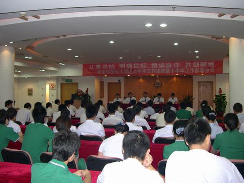 張家界國際大酒店為中外合資旅游酒店。酒店總投資約1.38億,總占地面積為53畝;主樓高十層,主樓建筑面積為20000余平方米。其設(shè)有標準客房、豪華客房、商務(wù)樓層及總統(tǒng)套間,共226間(套);與之配套的有中餐廳、西餐廳、風味廳、酒吧、咖啡廳、宴會廳、多功能國際會議中心、商務(wù)中心、美容美發(fā)中心、桑拿按摩中心、豪華歌舞廳、室外游泳池、網(wǎng)球場、球藝室及棋牌室等各類娛樂服務(wù)設(shè)施,一應(yīng)俱全。主樓前設(shè)有大型停車場、假山及瀑布。綜合樓高七層,內(nèi)有行政辦公室、員工宿舍樓、洗衣房和行政倉庫,而員工福利樓(員工餐廳、醫(yī)務(wù)室及娛樂室)和設(shè)備樓各一棟。