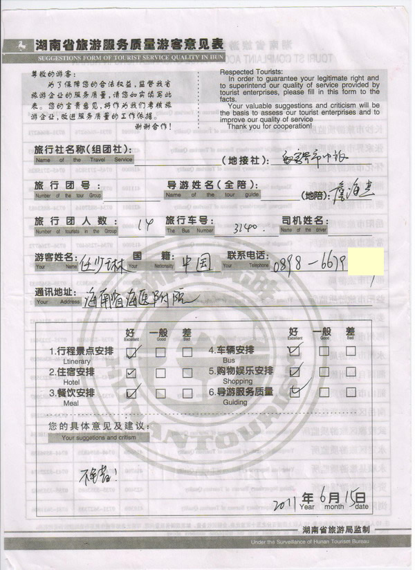 海南任少林一行14人旅游質(zhì)量回饋