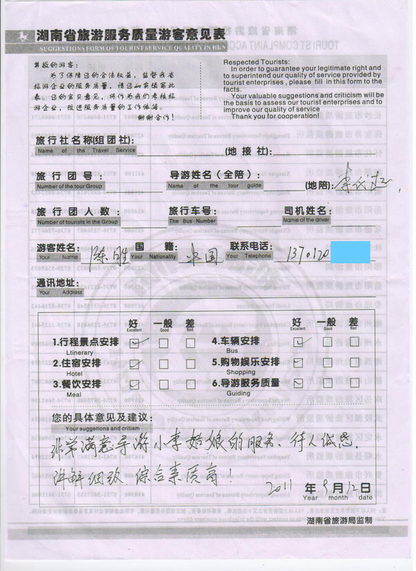 北京陳先生一行9人旅游質量回饋:安排的都很好。非常滿意導游小李姑娘的服務,待人誠懇,講解細致,綜合素質高!