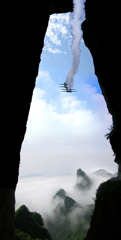 2006年3月,俄羅斯空軍“勇士”特技飛行表演隊(duì),駕駛蘇27重型戰(zhàn)斗機(jī)飛臨天門(mén)山,欲完成一次不可思議的特技飛行表演,想創(chuàng)造出重型戰(zhàn)斗機(jī)穿越天門(mén)的挑戰(zhàn)奇跡。盡管因巨大的風(fēng)險(xiǎn)和輿論壓力最終放棄“穿越天門(mén)”的挑戰(zhàn),但俄羅斯空軍在天門(mén)山上空進(jìn)行的精彩飛行表演仍然令人震撼。