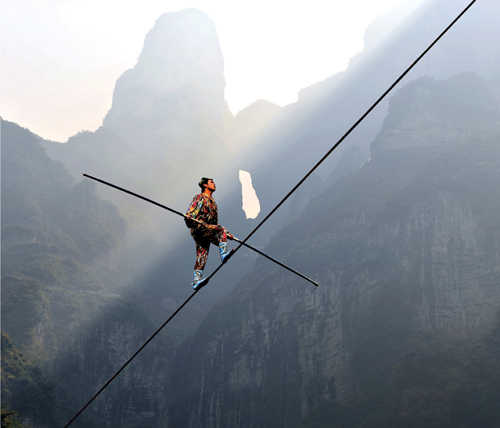 2008年10月,新疆達(dá)瓦孜絕技第七代傳人賽買(mǎi)提·艾山在天門(mén)山進(jìn)行了空前難度的極限坡度高空走鋼絲行走挑戰(zhàn)。鋼絲架設(shè)在天門(mén)山奇峰絕嶺間,長(zhǎng)700米,傾斜度達(dá)39°。此次挑戰(zhàn)的難度之大超乎想象,被眾人視為不可能完成的任務(wù)。賽買(mǎi)提最終功虧一簣,在離終點(diǎn)約60米處跌倒,但其勇氣和絕技令眾人折服。2009年4月,賽買(mǎi)提英雄歸來(lái),再次挑戰(zhàn)這條鋼繩并終于成功,在天門(mén)山創(chuàng)造出世界高空鋼絲行走最具難度和風(fēng)險(xiǎn)的一次極限征服。