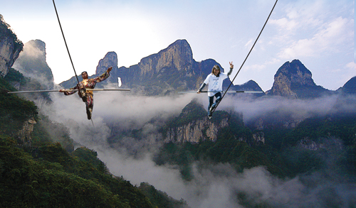 2010年3月20日,世界最優(yōu)秀的高空王子瑞士人弗雷迪·諾克與賽買(mǎi)提·艾山在坡度超過(guò)40度且極其光滑的天門(mén)山高山索道鋼繩上展開(kāi)了一次驚天對(duì)決,兩位曠世高手聯(lián)袂上演出一次空前難度和驚險(xiǎn)的高山索道鋼繩行走挑戰(zhàn)。