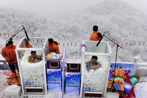 2011年1月3日,來(lái)自黑龍江的耐寒奇人金松浩和陳可財(cái),在海拔1518.6米的天門(mén)山主峰云夢(mèng)仙頂進(jìn)行“冰凍活人”極限耐受力大比拼,兩人在冰天雪地的高山戶外被冰塊埋置頸部比拼耐凍的持久能力。最終,金松浩堅(jiān)持時(shí)間長(zhǎng)達(dá)120分鐘,成為世界第一“冰人”,陳可財(cái)也堅(jiān)持到118分鐘,兩人雙雙打破吉尼斯世界紀(jì)錄。