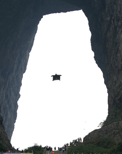 2011年9月24日,“2011翼裝飛行穿越天門(mén)”極限挑戰(zhàn)活動(dòng)在天門(mén)山震撼上演。來(lái)自美國(guó)、意大利、芬蘭等6個(gè)國(guó)家的9名翼裝飛行高手分別以天門(mén)山索道轎廂、山頂懸崖為起跳點(diǎn),進(jìn)行了精彩絕倫的翼裝飛行表演。當(dāng)天,全球最頂尖的“翼裝飛俠”,來(lái)自美國(guó)的杰布・科里斯還成功挑戰(zhàn)人類(lèi)首次無(wú)動(dòng)力翼裝飛行穿越天門(mén)洞。1999,世界特技飛行大師駕機(jī)穿越天門(mén),實(shí)現(xiàn)了人類(lèi)首次駕機(jī)穿越自然山洞的奇跡。2011,“穿越天門(mén)”挑戰(zhàn)12年后再次呈現(xiàn),舉世震撼!