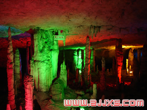 [鴛鴦瀑布]水晶山后有景名叫“鴛鴦”瀑布,像兩條瀑布流下來(lái),科學(xué)名稱“石幔”,它本來(lái)是一片片很薄的,像紅旗一樣,又稱為“石旗”,它的透光性也特別好,它的形成主要是水從高處往下流時(shí),礦物質(zhì)的沉淀而形成,它的顏色有白色,有黃色。成為白色的主要是洞頂較厚,水滴下來(lái)時(shí),過(guò)濾的比較好,含的碳酸鈣比較純,所以顏色成為白色,那么黃色主要是洞頂較薄,水滴下來(lái)時(shí)沒(méi)有很好的過(guò)濾,含得碳酸鈣就不純,而且?guī)в心噘|(zhì),所以顏色就成黃色。 |