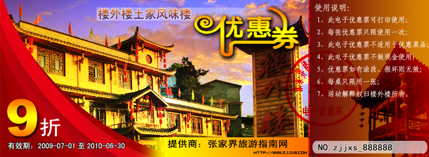 2、此優(yōu)惠劵可通過網(wǎng)絡(luò)打印(黑白、彩色亦可)在有效期內(nèi)及樓外樓土家風(fēng)味樓范圍內(nèi)使用; |