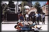 (2)臥刀破石:先固定兩把大刀,刀口朝上,臥刀者運氣后,由其他人抬臥于刀口上(有仰臥、俯臥兩種),然后在臥刀者腹部或背部置一碩大石條(約數(shù)百斤),由一個或兩個彪形大漢掄大錘狠擊石條直至斷裂破碎為止。