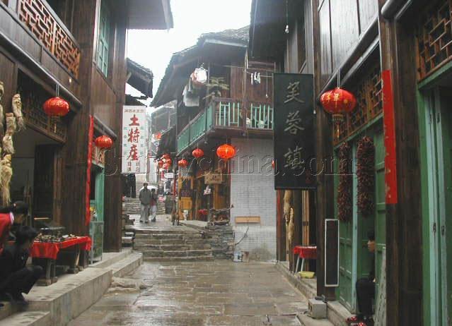 溪洲銅柱現(xiàn)存于芙蓉鎮(zhèn)民俗風(fēng)光館內(nèi)。公元940年,楚王馬希范與溪州刺使彭士愁多年交戰(zhàn)媾和,締結(jié)盟約,劃疆而冶,鑄5000斤銅柱為證。據(jù)史截:“后晉天福四年(公元939),溪州刺史彭士愁與當(dāng)時(shí)占據(jù)湖南的楚王馬希范發(fā)生溪州之戰(zhàn)。彭士愁戰(zhàn)敗后于后晉天福五年(公元940年)與馬希范議和,把戰(zhàn)爭的經(jīng)過和議和的條款,鐫刻于銅柱之上。銅柱重五千斤,高丈二尺,入土六心,形為八面,中空,內(nèi)實(shí)鉅錢,柱端覆蓋銅頂,銘誓狀于銅柱之上,立于會溪,宋天禧二年(公元1018年)重立時(shí),又羼刻了一些土官銜名。清中葉,柱上銅頂被盜,沉于江心,柱內(nèi)銅錢亦被人以飴粘錢殆盡。清光緒十一年(公元1885年),永順府知府張?jiān)鴵P(yáng)建亭保護(hù)。民國年間亭被毀。”銅柱的銅質(zhì),精純光潤;八面所鐫顏、柳體陰文,雖經(jīng)千載風(fēng)雨洗刷,霜雪蝕磨,仍清晰如初。溪州銅柱是研究土家族古代歷史的重要文獻(xiàn)。土家族視銅柱為神物。 古鎮(zhèn)石板街遠(yuǎn)遠(yuǎn)望去,總感覺芙蓉鎮(zhèn)五里青石板街就像一本線裝古籍的書脊,書頁被上蒼之手打開,靜謐而又穩(wěn)重地?cái)傇谟纤舆,那書頁上凌空的吊腳樓和發(fā)生在樓里樓外的悲歡離合便隨歲月而動,演繹出許多鏗鏘溫馨、跌宕起伏的故事來…… 湘西芙蓉鎮(zhèn)這個(gè)看上去普普通通的村落,原來是秦漢時(shí)土王的王都,古稱酉陽,五代十國時(shí)稱溪州。后因電影《芙蓉鎮(zhèn)》在此拍攝,于是人們便把此地叫做芙蓉鎮(zhèn)。 史書記載“位酉水北面,是酉水的重要碼頭,通川黔、達(dá)鄂瀘,舟楫之便,得天獨(dú)厚”。 從碼頭開始綿亙而上的石階,那是一條長達(dá)五里貫穿古鎮(zhèn)的青石板路,它沒有名字,于是人們就直接管它叫五里長街。踏上古街,似乎踩在被悠長歲月遺落的碎片上面。不知不覺走到掛有“土家觀瀑吊腳樓”牌匾的民俗博物館前,從手搖腳踏的棉花機(jī)、閹豬鳴號的羊角到世代相傳的雕花牙床,近百件散發(fā)著鄉(xiāng)土氣息的民間用具,展示著土家族古老豐富的歷史?醋o(hù)人說,這是一位土家族年輕人爬山涉水收集來的,靜靜地訴說著這個(gè)小村古老的過去。這棟三層的小樓,一半落在河岸上,另一半?yún)s是由水泥柱支撐著,水泥柱直插河底,任水流日日夜夜地沖刷,小小的吊腳樓仍穩(wěn)穩(wěn)當(dāng)當(dāng)站在那里,任憑時(shí)間的流逝。好聰明的土家人,巧借一片水面,竟建起了如此妖嬈的住房。 拾級而上,山路一般的陡峭。兩旁的青瓦木房鱗次櫛比,順山勢而錯(cuò)落有致。幾家織錦商店已經(jīng)開門,說是商店,不如叫作坊更確切些,因?yàn)榈昀锏闹饕娣e,都為織錦機(jī)所占領(lǐng),色彩斑斕的挎包、壁掛、床上用品等都掛在墻上,游客不僅可以駐足欣賞姑娘們的手和梭子在織錦機(jī)上飛動的瀟灑,還可以慢慢觀賞陳列品的藝術(shù)特色。據(jù)說,當(dāng)?shù)氐墓媚镌瓉碇唤o親人和情郎穿針引線,如今卻生產(chǎn)出異彩紛呈的土家織錦來賣給陌生人,從情感所系的“非賣品”到只有技巧表現(xiàn)的商品,這種生活方式和情感上的跨越,仿佛不過是一夜之間的事。 有趣的是,米豆腐沿街都是,每一家都掛出電影《芙蓉鎮(zhèn)》的劇照,以示自己的正宗。其實(shí)在電影拍攝之前,米豆腐就早已是這里的特色,為什么要依賴那一個(gè)虛構(gòu)的故事呢?20年前,一部電影把“深居閨閣人未識”的這個(gè)小小村鎮(zhèn),從地圖上尋找出來,放在世人面前,然后將影響這里的多少代人,甚至深入到他們的骨髓。從那以后,曾經(jīng)與世隔絕的寧靜被打破了,而這種深刻的影響,大概就是從一碗米豆腐開始。 傍晚還剛剛來臨,長街上的小吃店就紛紛亮起昏暗燈光。這些家庭式小店,全都是當(dāng)?shù)厝藦淖约杭曳殖鲆粔K地方來順帶做的。鮮甜的桂花魚,以及肥美的“天下第一螺”,和米豆腐一樣,成為那里最難忘的美味。在村子里一座貞節(jié)牌坊旁,又發(fā)現(xiàn)清心透涼的另一種美味———冰鎮(zhèn)土家自釀糯米酒。聰明能干的土家人,他們自給自足,自在悠閑地生活著,男人在外打漁,女人在家織布,世世代代,沉浸在自己的文化里面。